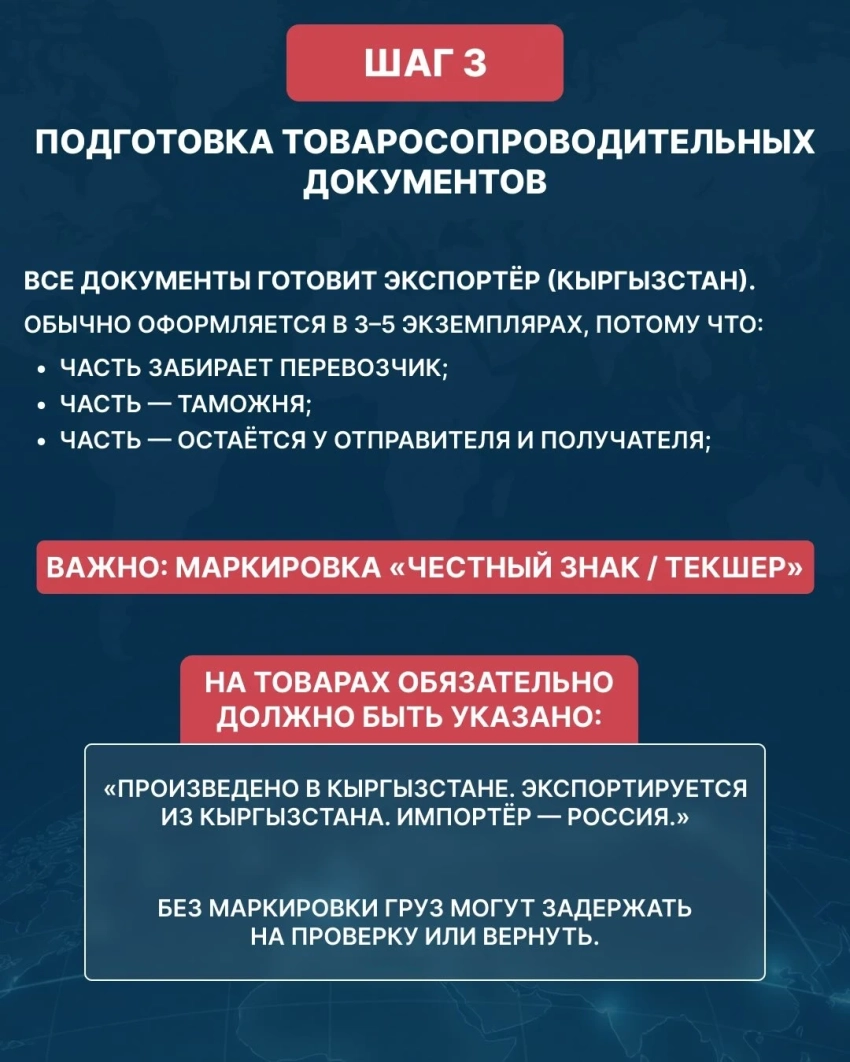 Третий этап — это подготовка товаросопроводительных документов. Экспортер должен собрать комплект из нескольких экземпляров, включая электронный счет-фактуру, упаковочный лист, товарную накладную, CMR, доверенность для водителя и сертификаты соответствия, если на продукцию требуется обязательная сертификация. В Минэкономе также напомнили о необходимости маркировки «Честный знак / Текшер» и указания происхождения товара.