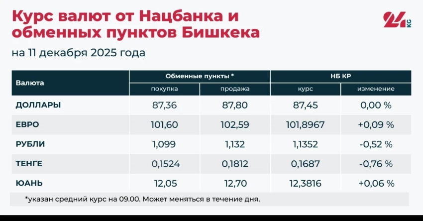 - Официальный курс от НБ КР: 87,45 сома (без изменений).
