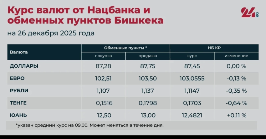 • Средний курс в обменных пунктах: покупка — 87,28 сома, продажа — 87,75 сома.