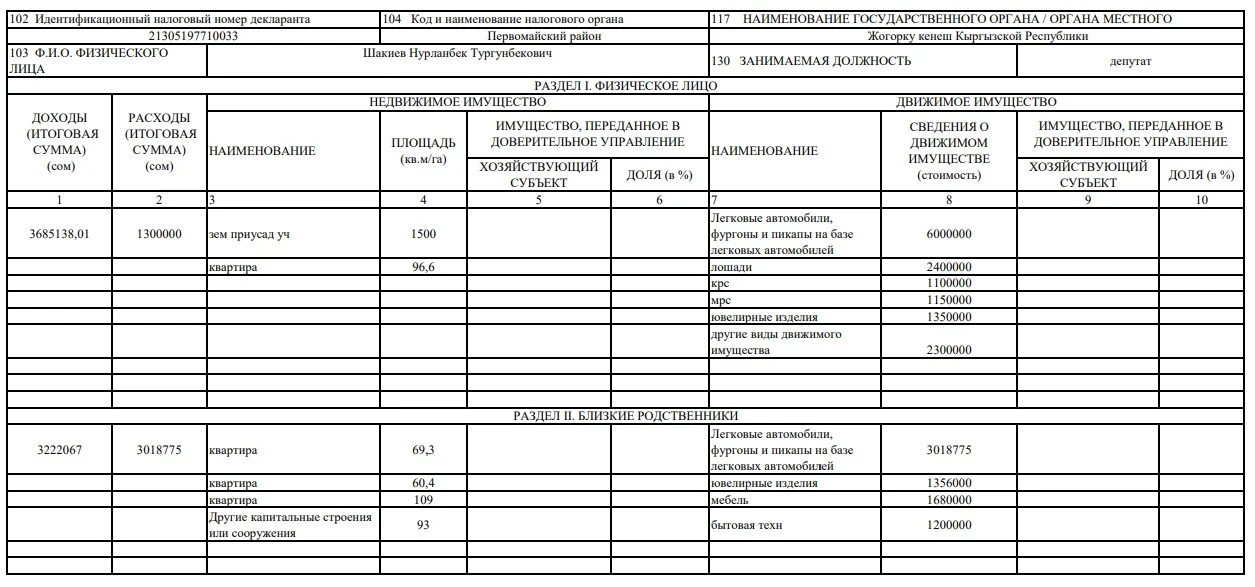 По информации ГНС, спикер Жогорку Кенеша Нурланбек Тургунбек уулу объявил доход в 3 млн 685 тыс. 138 сомов, в то время как его расходы составили 1,3 млн сомов.