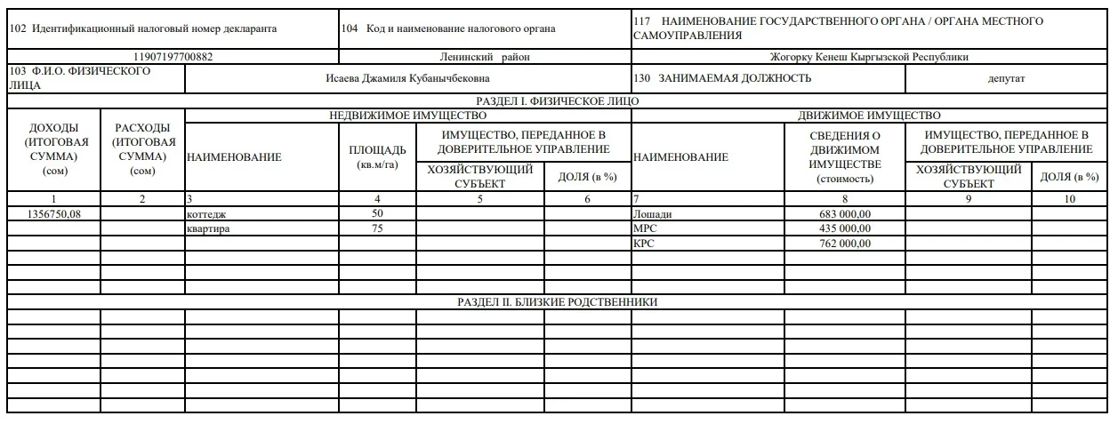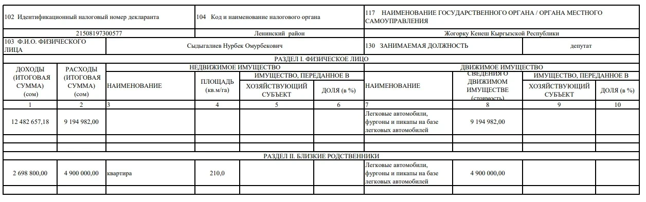 Близкие родственники Сыдыгалиева задекларировали доход в 2 млн 698,8 тыс. сомов и расходы в 4,9 млн сомов. В их активе есть квартира площадью 210 кв. м и автомобили на сумму 4,9 млн сомов.