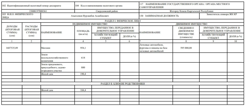 Вице-спикер Нурланбек Азыгалиев указал доход в 1 млн 687 тыс. 535,89 сома, однако данные о расходах отсутствуют. Среди его имущества – магазин площадью 954 кв. м, жилой дом на 190 кв. м, легковые автомобили на сумму 595 тыс. сомов, а также земельные участки: 614 кв. м несельскохозяйственных земель и 800 кв. м приусадебных и садовых участков.