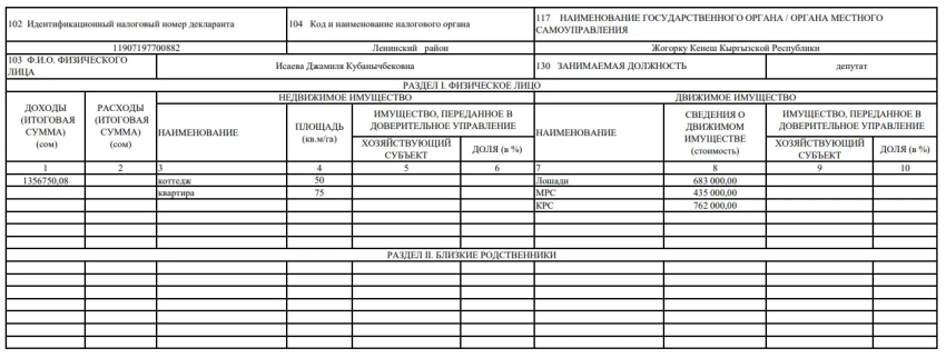 Вице-спикер Джамиля Исаева задекларировала доход в 1 млн 356 тыс. 750 сомов. В ее собственности находятся коттедж площадью 50 кв. м, квартира на 75 кв. м, а также лошади на сумму 683 тыс. сомов, овцы на 435 тыс. сомов и крупный рогатый скот на 762 тыс. сомов.