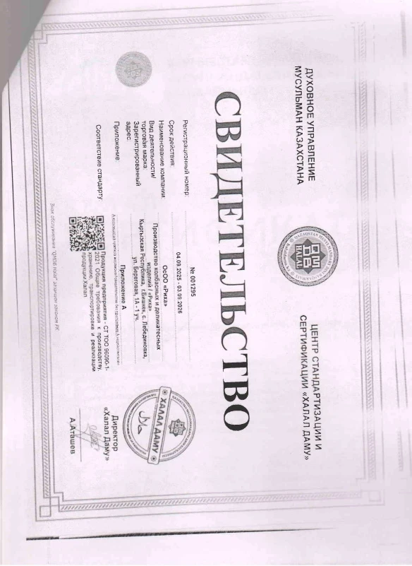 - Сертификат "Халал" от Кыргызстан мусулмандарынын дин башкармалыгы (КР) № KG 2206/0925;