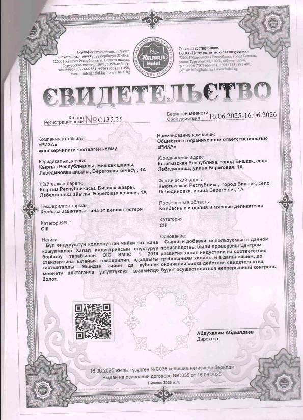 - Свидетельство Центра развития халал-индустрии (КР) № C135.25;
