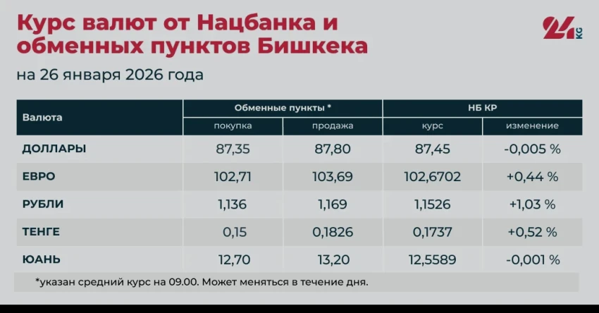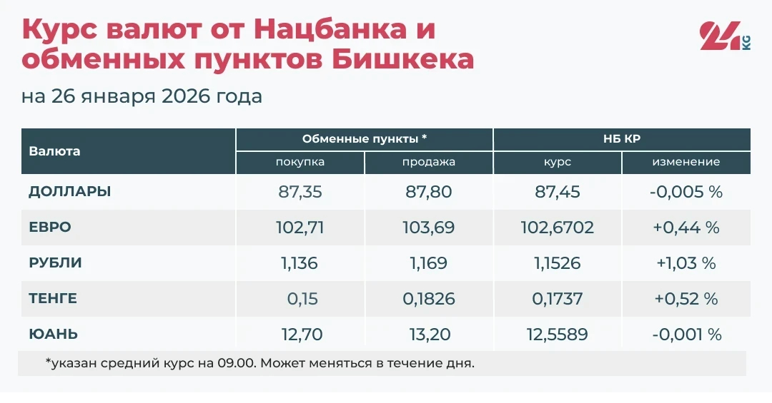 По информации Национального банка Кыргызстана и обменных пунктов Бишкека, наблюдается рост официальных курсов евро, российского рубля и казахстанского тенге, в то время как доллар и китайский юань показали снижение. Курс доллара остается стабильным.