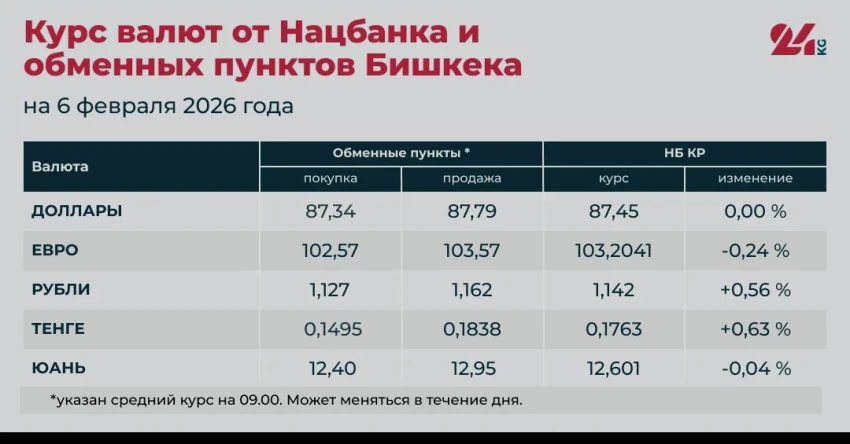 • Средний курс в обменниках: покупка — 87,34 сома, продажа — 87,79 сома.