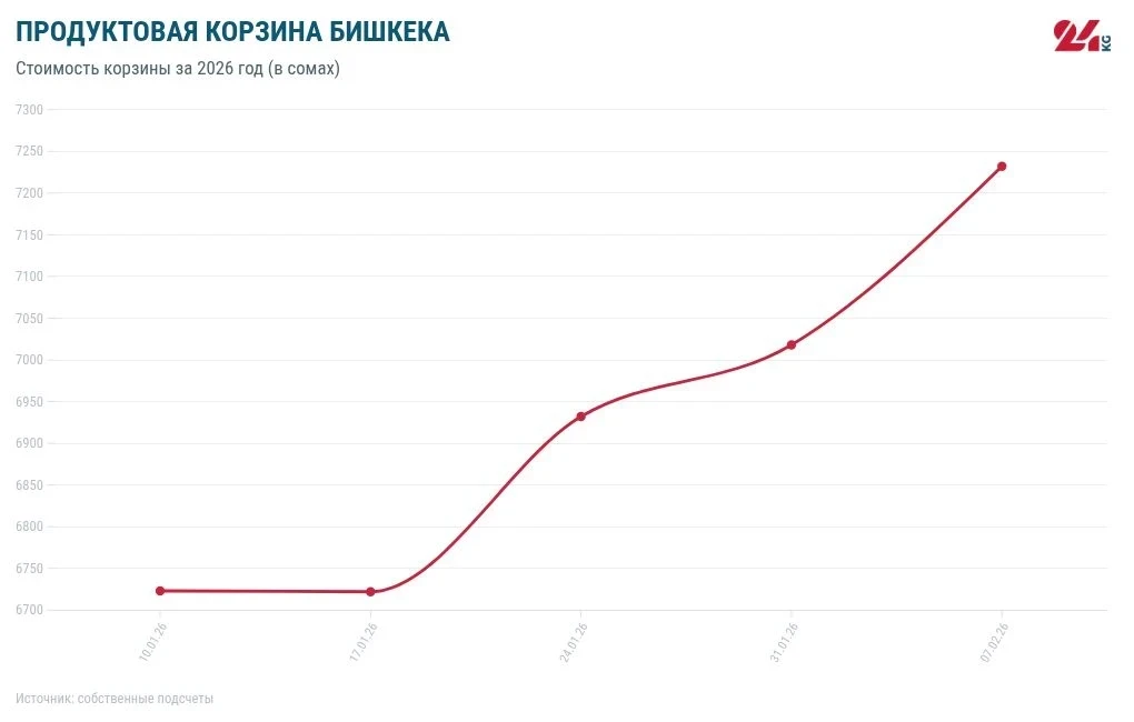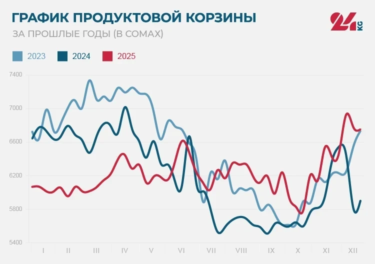 В течение 2025 года продуктовая корзина увеличилась в цене на 686 сомов. Минимальная стоимость была зафиксирована 18 октября — 5 тысяч 791 сом, а максимальная — 6 декабря — 6 тысяч 927 сомов.
