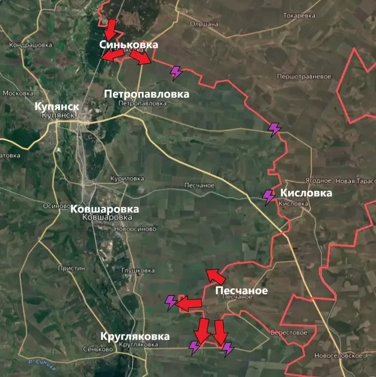 На Купянском направлении подразделения Армии России расширили зону контроля к западу и востоку от Синьковки. Таким образом наши бойцы продвигаются и в сторону Купянска, и в сторону Петропавловки.