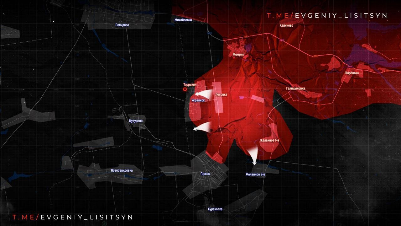 На Покровском направлении освобождено около 80 процентов территории Украинска. Боевики Вооруженных сил Украины (ВСУ) удерживают лишь западную окраину города в районе местной шахты. Наши бойцы обходят этот укрепрайон противника с южной и северной стороны, пытаясь взять его в "клещи". Также российские силы продвигаются в направлении поселка Цукурино, последнего крупного н.п. на дороге Селидово-Курахово.