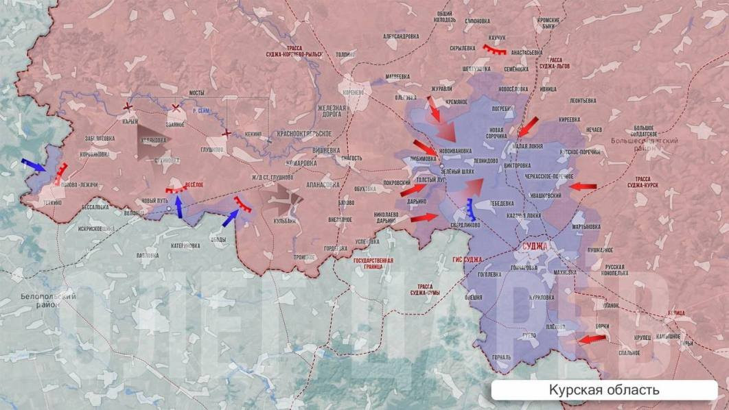 На этом же участке есть и другой успех - сегодня наши военные оттеснили ВСУ из Зеленого Шляха, а также поселков Покровский и Нижний Клин. Здесь усилия наших военных сосредоточены на удержании контроля над участком трассы Коренево-Суджа между Зеленым Шляхом и Свердликово. По ней ВСУ могут пытаться выйти из окружения в Толстом Луге и Любимовке, сообщает Олег Царев в своем Telegram-канале.