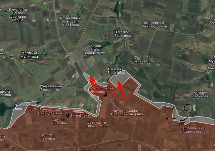 На Покровском: российские войска с опорой на Воздвиженку давят в направлении Барановки.