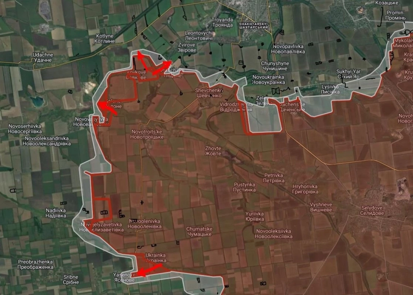 Российские войска продвинулись в направлении Ясеновое на участке шириной до 2.38 км на глубину до 1.52 км.