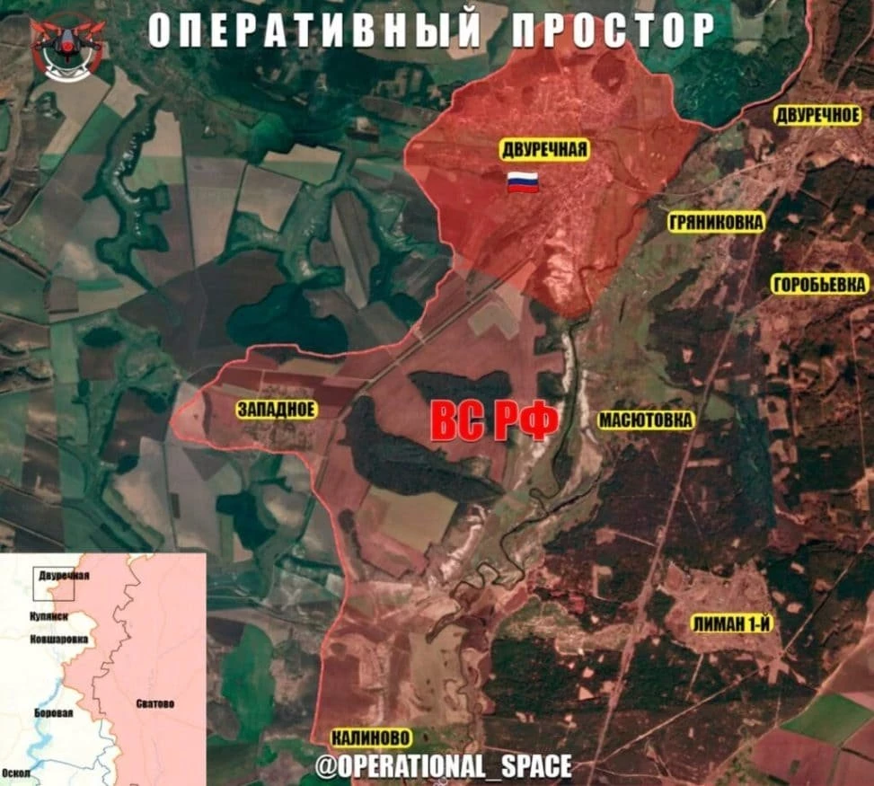 На Купянском направлении Минобороны России заявило об освобождении пгт Двуречная. Мы создали большой плацдарм на западном берегу Оскола позволит наступать по нескольким направлениям, в первую очередь, в охват с северо-запада Купянска.