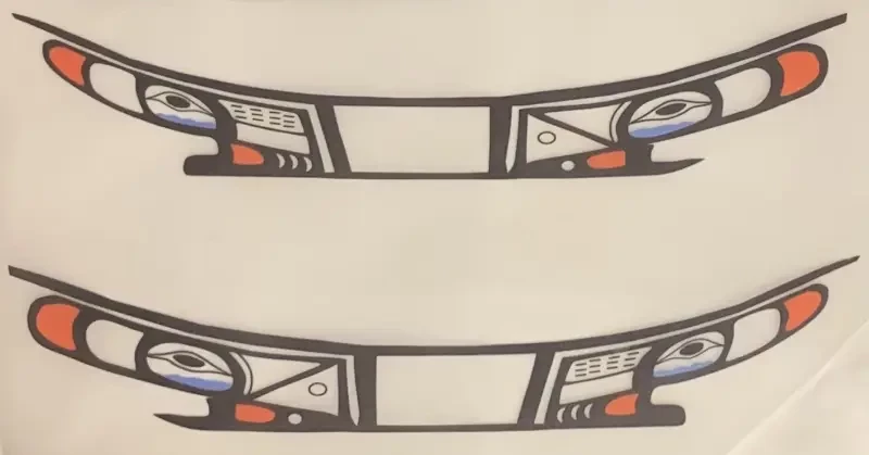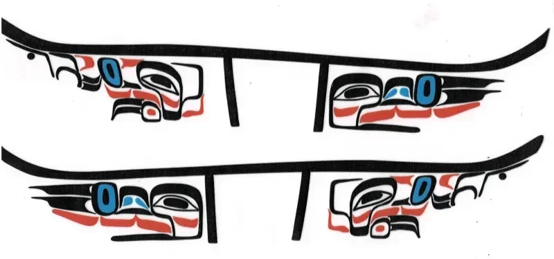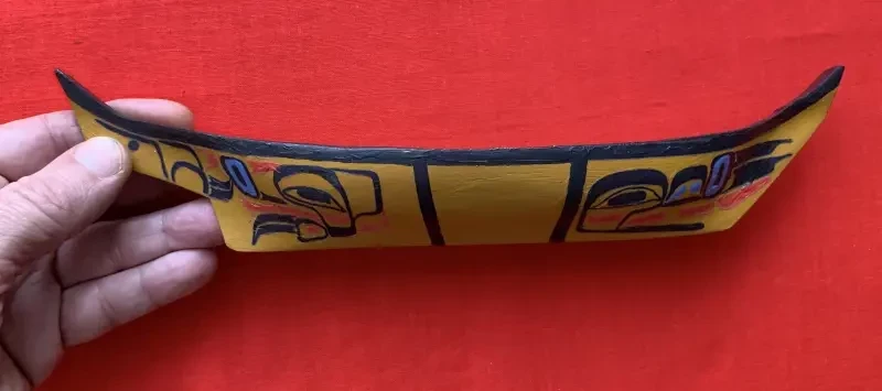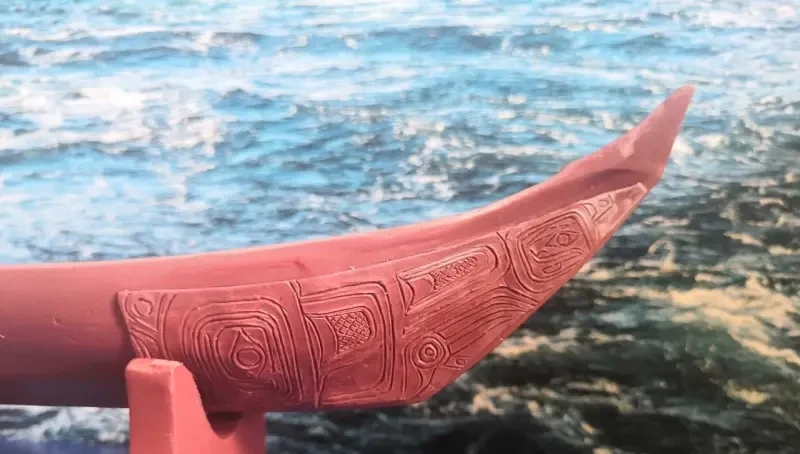 Готовая модель каноэ хайда с нанесённым на борта рисунком из термонаклеек