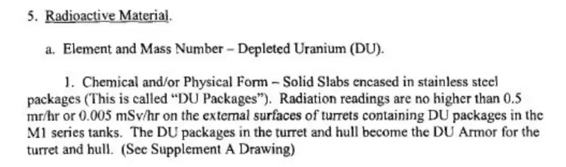 Химическая и/или физическая форма – твердые пластины, заключенные в пакеты из нержавеющей стали (называемые «пакетами DU»). Радиоактивное излучение не превышает 0,5 мР/ч (миллирентген в час) или 0,005 мЗв/ч (миллизиверт в час) на внешних поверхностях башен, содержащих DU-пакеты, в танках серии M1.