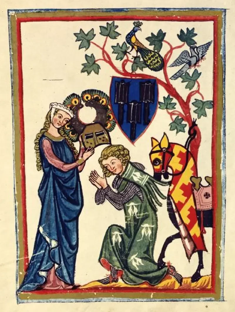 И благодаря «Манесскому кодексу» мы сегодня совершенно точно знаем, как выглядели многие рыцари-миннезингеры около 1300 года. А еще тот же кодекс представляет собой обильный источник визуализированных образов куртуазного поведения. Так, лист 231r, например, показывает рыцаря-миннезингера по имени Винли, который сидит в шатре с двумя дамами, одна из которых вручает ему кольцо и щит, а другая — любопытный шлем, покрытый шляпой, да еще и перевязанный шарфом.