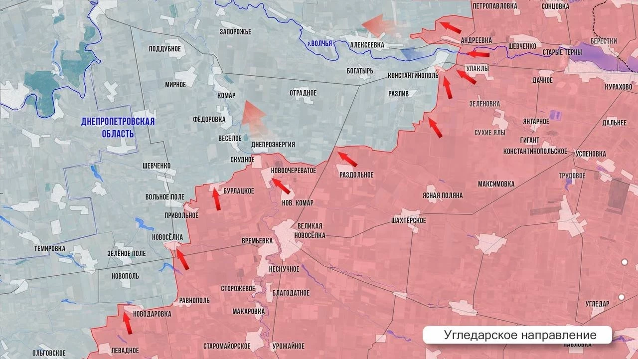 На Угледарском фронте северо-западнее Великой Новоселки ВС РФ атакуют и не оставляют противнику шанса стабилизировать обстановку. За февраль наши освободили более 100 км², а сегодня МО подтвердило контроль над Бурлацким и Скудным. ВС РФ зачистили карман между Привольным и Бурлацким, расширив зону контроля на 4,5 км для атак на Шевченко - ключевого логистического узла ВСУ в этом секторе. В районе Константинополя ВС РФ продвинулись на глубину 1 км. Основные бои идут в западной части села. С юга российские подразделения подпирают основной вражеский хаб на этом участке – село Богатырь. На северном участке фронта идёт зачистка северной части Андреевки, наши закрепляются в посадках на окраине Алексеевки.
