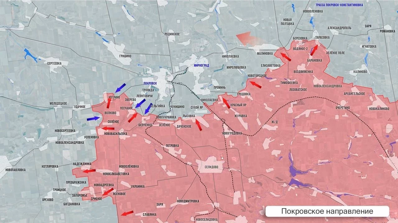 На Покровском направлении особых изменений за сутки нет - продолжаются тяжёлые бои в районе сёл Удачное, Котлино, Песчаное, Шевченко и Тарасовка. Новых успехов у ВСУ нет, но и нашим возвращение контроля и продвижение даётся крайне тяжело. Враг утверждает, что российское командование перебросило для усиления покровской группировки ресурсы из-под освобождённого Константинополя.