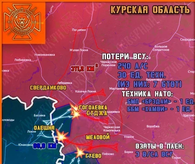 В Курской области ВСУ упорно обороняет оставшиеся под его контролем участки вокруг Гоголевки, Олешни, Гуево и хутора Горналь. Также за врагом пока остаются позиции в нескольких лесополосах, где они оборудовали опорные пункты.