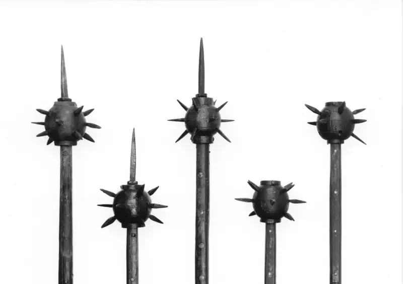 Два стальных шестопера. Верхний имеет шестиугольное стальное древко с точеной деревянной рукояткой. Головка образована шестью крепкими заостренными фланцами, которые заметно утолщаются к кончикам. Ок. 1500 г. Нижний шестопер деревянной накладки рукояти не имеет. Королевский арсенал, Лидс.
