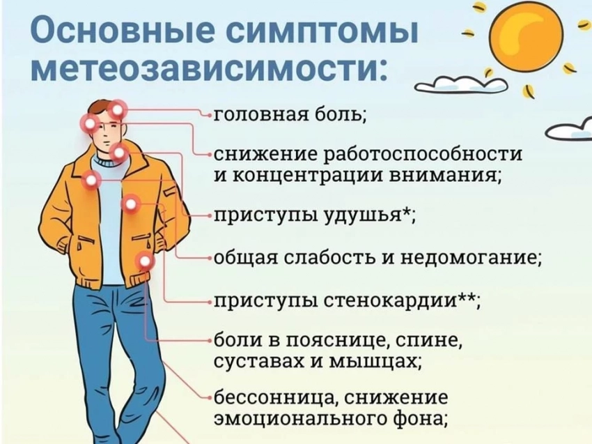 "Могут начаться головная боль, головокружение. Нередко появляется ноющая боль в суставах, повышается или понижается артериальное давление, обостряются хронические болевые синдромы, возникает ощущение давления в глазных яблоках", - поведала специалист.