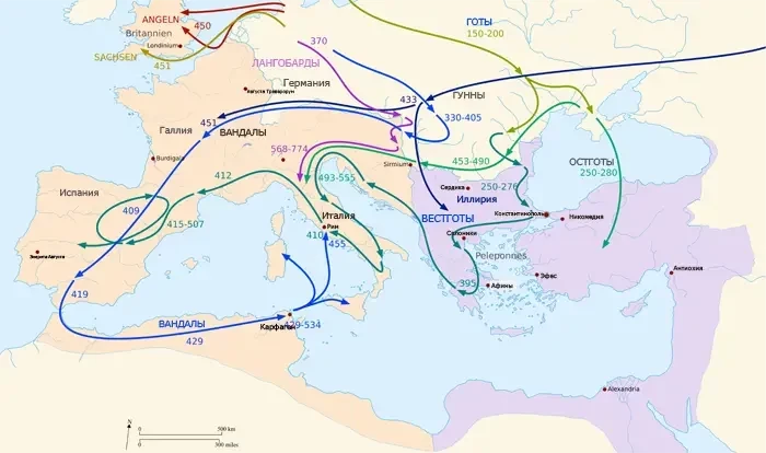 Карта примерного расселения варварских народов на территории Западной Римской империи во времена Великого переселения народов (ок. 300–600 гг. н. э.), также известного как варварские нашествия — периода в истории Европы, отмеченного масштабными миграциями варваров, которые привели к падению Западной Римской империи и последующему заселению ее различными племенами и созданию постримских варварских королевств. Источник: Eigenes Werk