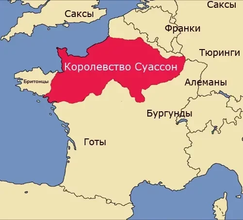 Карта приблизительной площади владений Сиагрия 486 г. н. э. и расселения германских племен. Римский патриций и магистр армии (magister militum), Сиагрий правил на севере Галлии как представитель Римского государства, в то время как сама римская власть на Западе уже пала, упраздненная варваром Одоакром. Поэтому, не провозглашая себя императором и оставаясь римским чиновником, Сиагрий никакому императору не подчинялся — Константинополь находился слишком далеко от Галлии, а связи со столицей империи на Босфоре Сиагрий не поддерживал, так что лишь благодаря его уважению к римским традициям и неприятию сепаратизма его владения юридически оставались частью римского диоцеза. Своей резиденцией Сиагрий выбрал Суассон, расположенный между Парижем и Реймсом…