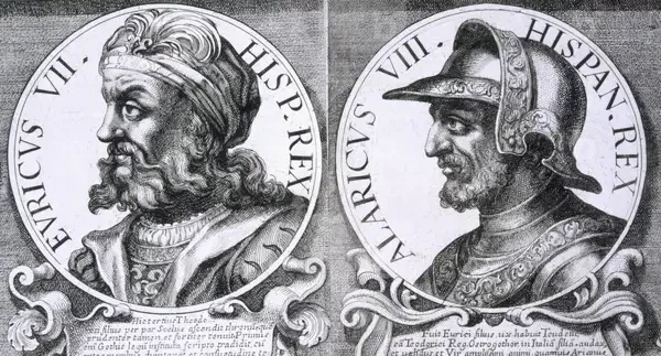 Портреты королей вестготов из рода Балтов. Слева: Эйрих (420-484), создавший кодекс Эйриха, в котором готские традиции удачно сочетались с классическим римским правом. При этом короле вестготы были уже не простым союзом племен, а полноценным государством во главе с правителями из рода Балтов. Справа: Аларих II (466-507), сын Эйриха, занявший в Тулузе престол своего отца после его смерти. Власть Алариха II распространялась на огромную территорию бывшей Римской империи - от Атлантики до Альп и от Гибралтара до реки Луара. Ко времени восшествия его на престол, это варварское королевство было самым обширным в Европе. Литография. Источник: Bridgeman Images