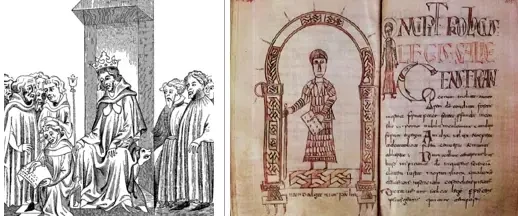 На изображении слева: Хлодвиг, король франков, дарует народу «Салический закон». Французская миниатюра XIV века. Справа: наиболее ранний из сохранившихся текстов «Салической правды», хранящийся в Национальной библиотеке Франции (Париж). «Салическая правда» была первым общим законом, который включал в себя вопросы семьи, наследования и морали. Рукопись была написана на латыни. Некоторые главы были взяты из законов рухнувшей Римской империи и сочетались с законами, присущими германским традициям. Эта юридическая система, созданная Хлодвигом, серьезно повлияла на будущие европейские правовые системы и содержала список примерно из 60-70 статей, касающихся уголовного и судебного права. В каком-то смысле, «Салическая правда» заложила основы будущего феодализма.