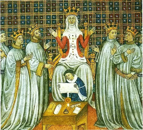 Королева Клотильда (в центре) руководит разделом королевства Хлодвига I между его четырьмя сыновьями (Теудерихом I, Хлодомером, Хильдебертом I и Хлотарем I), которые собрались вокруг нее. Источник: Муниципальная библиотека Тулузы