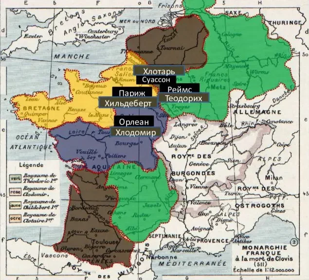 После кончины Хлодвига, следуя франкской традиции, все его четыре сына — Теодорих I, Хлодомир, Хильдеберт I и Хлотарь I — разделили между собой государство.
