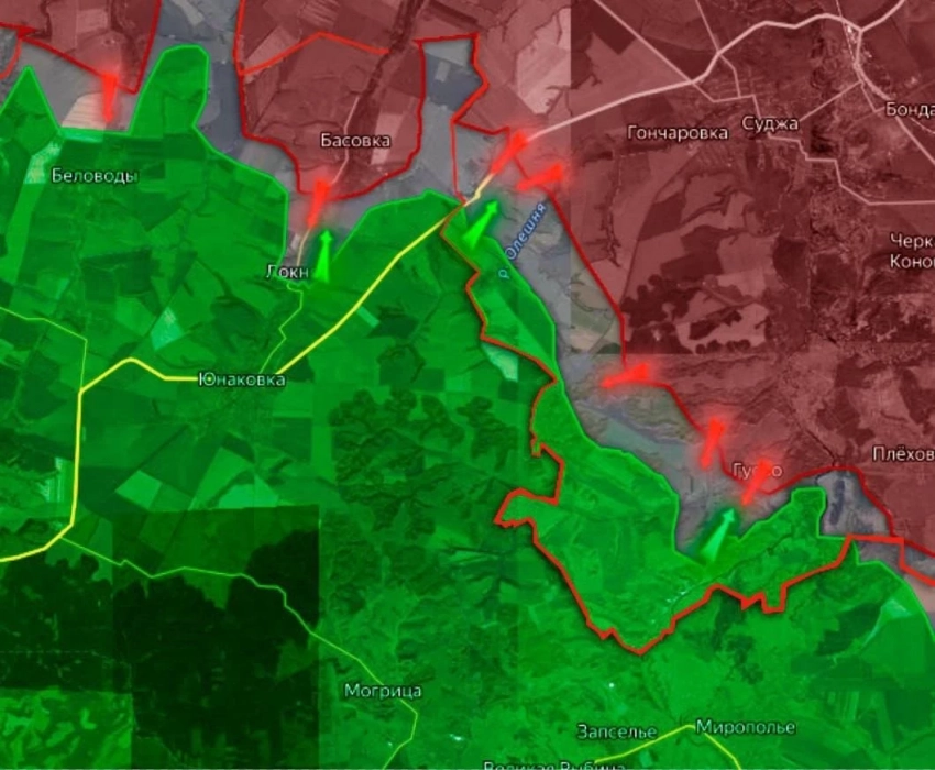 Восточнее Олешни наши части выбили ВСУ из нескольких опорных пунктов, продвинувшись по восточной окраине балки. Наши продолжают штурмовать район с двух направлений - севера и востока. На территории Сумской области наши ударили по очередной штурмовой группе ВСУ, двигавшейся к Олешне из Юнаковки.