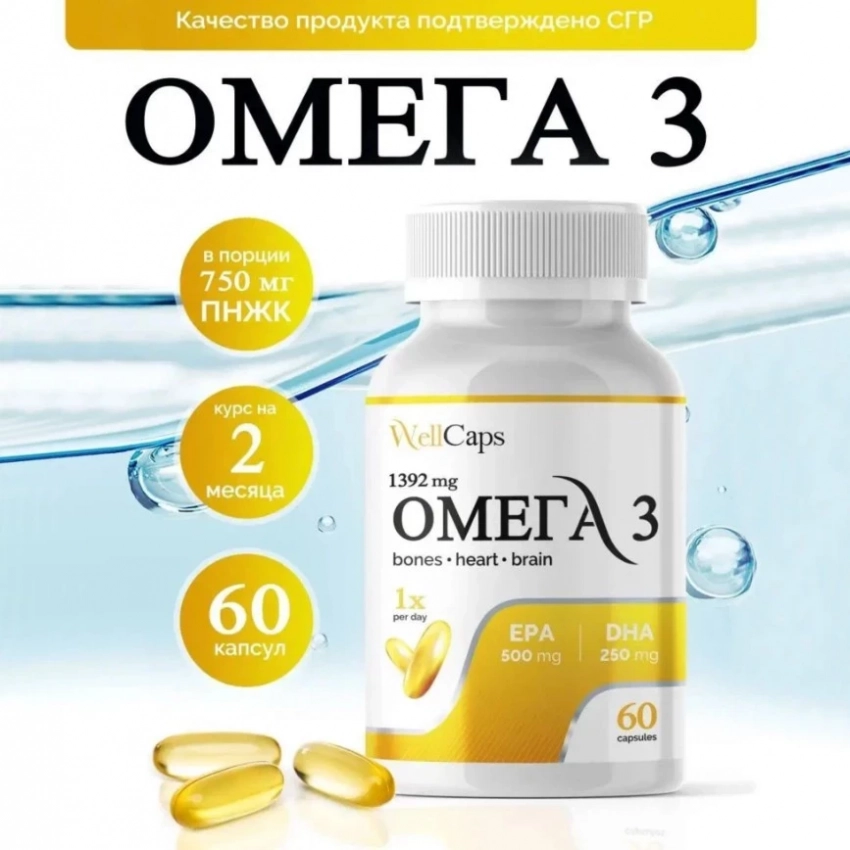 Омега-3 от Well Caps — это высококонцентрированная добавка, содержащая полиненасыщенные жирные кислоты EPA и DHA, необходимые для нормальной работы организма. В одной капсуле — 75% ПНЖК, что делает продукт мощным помощником для улучшения состояния сердечно-сосудистой системы, нормализации давления, поддержания здоровья суставов и нервной системы. Также он помогает укрепить иммунитет и улучшить состояние кожи. Это отличный выбор для тех, кто хочет улучшить общие показатели здоровья и замедлить процессы старения.