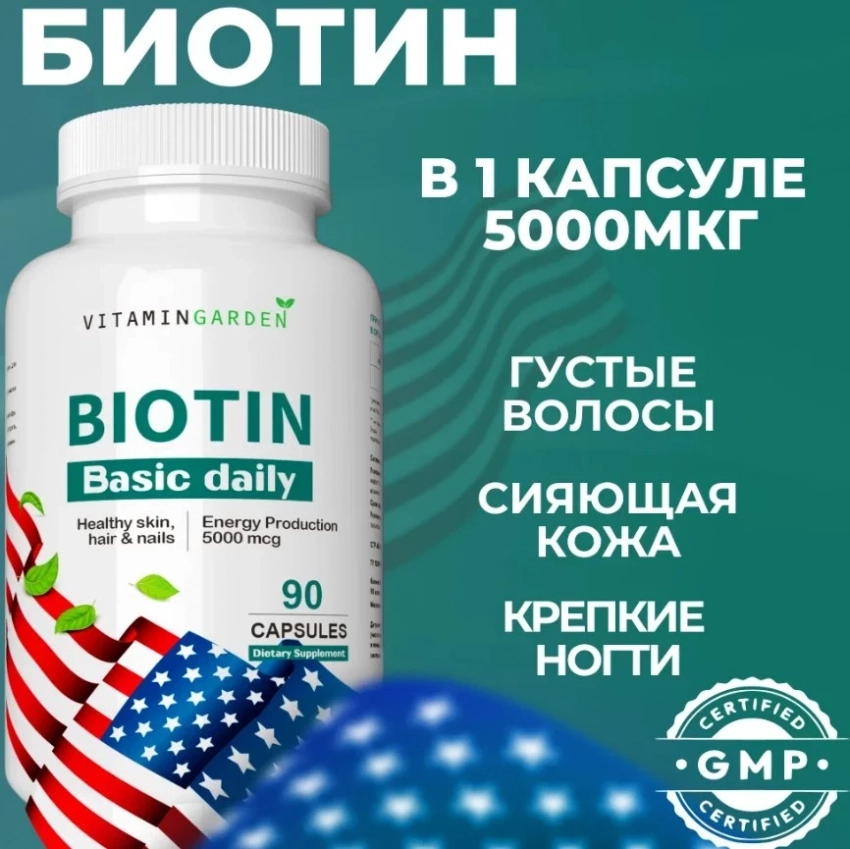 Витамины BIOTIN от Vitamin Garden — это идеальный комплекс для борьбы с выпадением волос и улучшения состояния кожи и ногтей. Содержат биотин (витамин В7), который активно способствует укреплению волосяных фолликулов и улучшению обменных процессов в организме. Благодаря высокой дозировке (5000 мкг) и уникальной формуле для лучшего усвоения, эти витамины быстро решают проблему ломкости и выпадения волос, попадая в топ бадов для волос. Идеально подходит для людей с активным образом жизни.