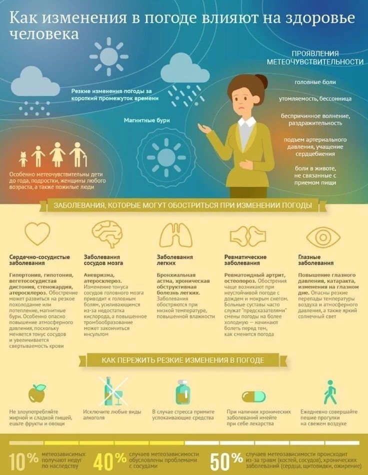 Метеозависимые могут почувствовать слабость, головокружение, разбитость, вялость, снижение работоспособности. У людей может снижаться давление, а у гипертоников, наоборот, повышаться.