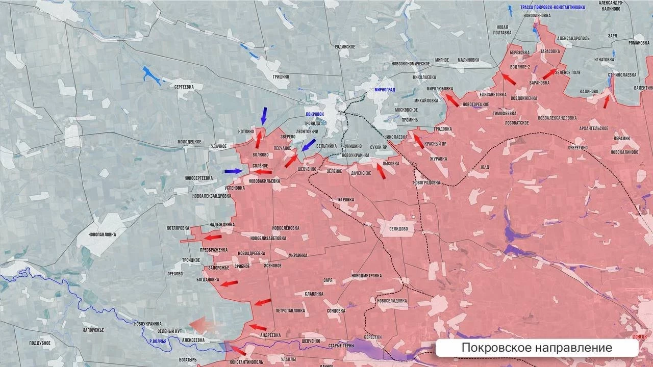 На Покровском фронте ВСУ накатывали на российские позиции в районе Алексеевки, Троицкого, Новоалександровки, Новосергеевки. На восточном охвате Покровска противник работает по нашим позициям в Удачном-Котлино. Наши закрепляются в центральной части посёлка Леонтовичи (Первомайское) севернее Зверево. На западном охвате отбиты контратаки ВСУ в районе Миролюбовки и Елизаветовки. Вчера наши попытались забрать тела погибших товарищей, однако на обратном пути к своим позициям по эвакуационной группе были нанесены удары FPV-дронами.
