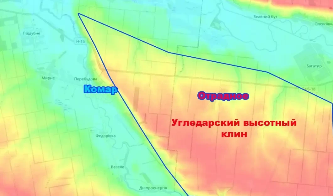 Таким образом российские войска забирают под свой полный контроль фактически весь этот высотный клин, за которым открывается несколько километров низменности. И ключевым населённым пунктом на этой низменности является остающийся под контролем противника Комар. Для сравнения – он по своей географической высотности находится почти на 50 м (высота 17-18 этажного дома) ниже Отрадного.