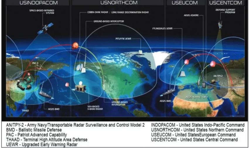 Изображение, дающее общее представление о сферах охвата, обеспечиваемых нынешними элементами противоракетной обороны США на территории Соединённых Штатов и в других странах мира