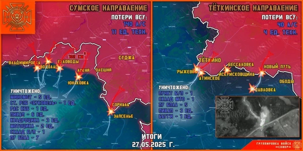 Накануне группировка войск "Север" уничтожала передовые и штурмовые подразделения противника на Тёткинском и Глушковском направлениях, продолжила создание полосы безопасности в Сумской области.