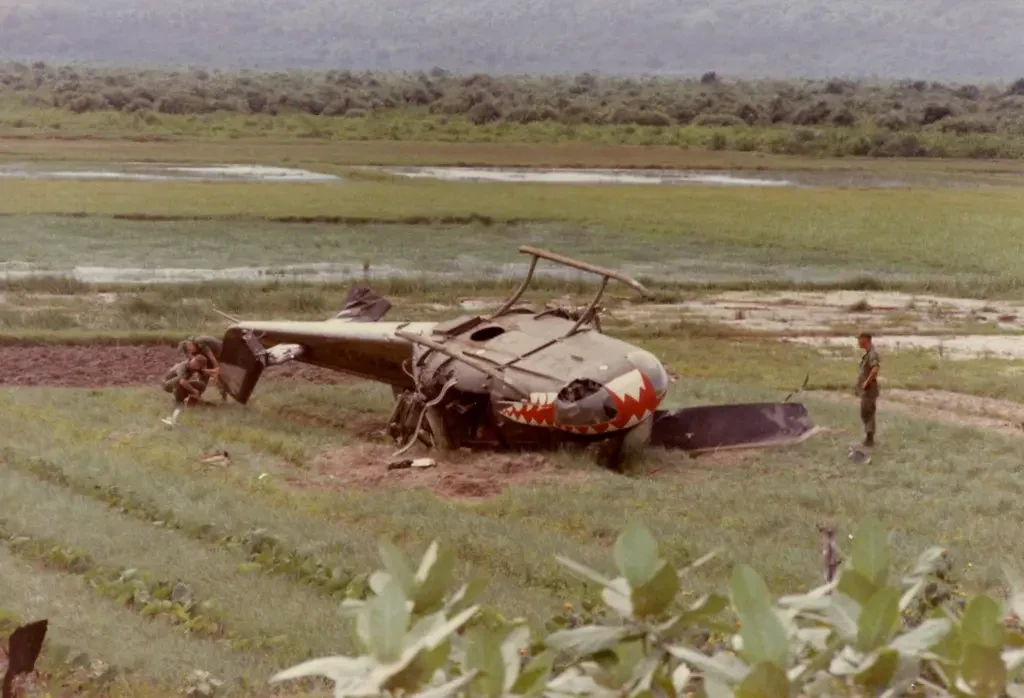 Солдаты армии США работают с вертолётом OH-6, сбитым в провинции Тайнинь в декабре 1967 года во время войны во Вьетнаме.