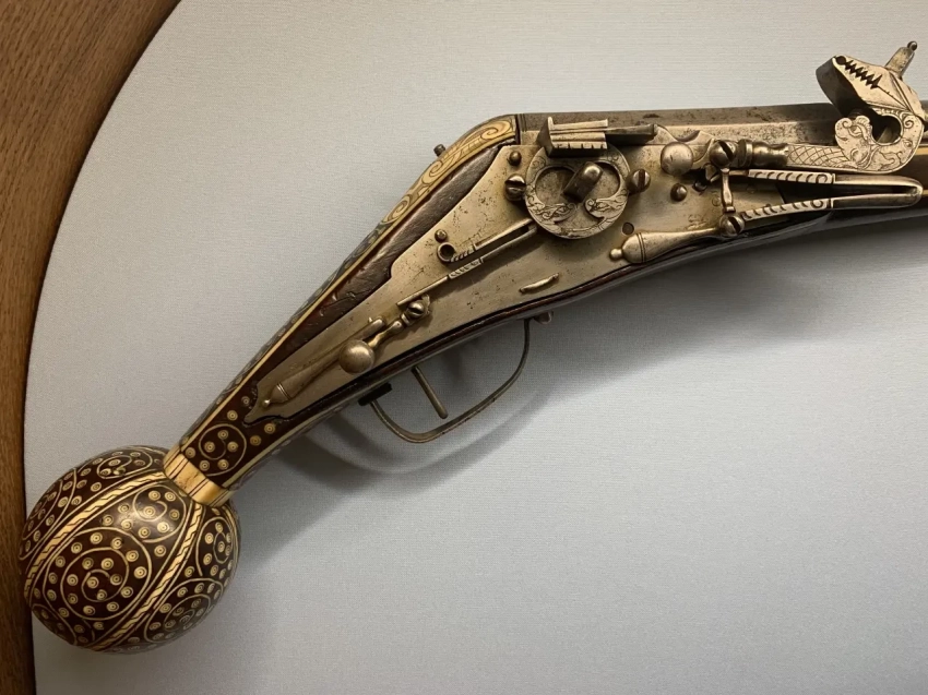 Колесцовый пистолет немецкой работы с инкрустацией из слоновой кости. Случается, что экскурсоводы говорят, что яблоко на рукоятке служило для того, чтобы бить врага по голове, и да, в горячке боя бывало и такое, но только в реальности это был всего лишь… пенал для принадлежностей, тех же, скажем, запасных кремней! Потому-то, кстати, его «яблоко» так старательно и украшено инкрустацией.