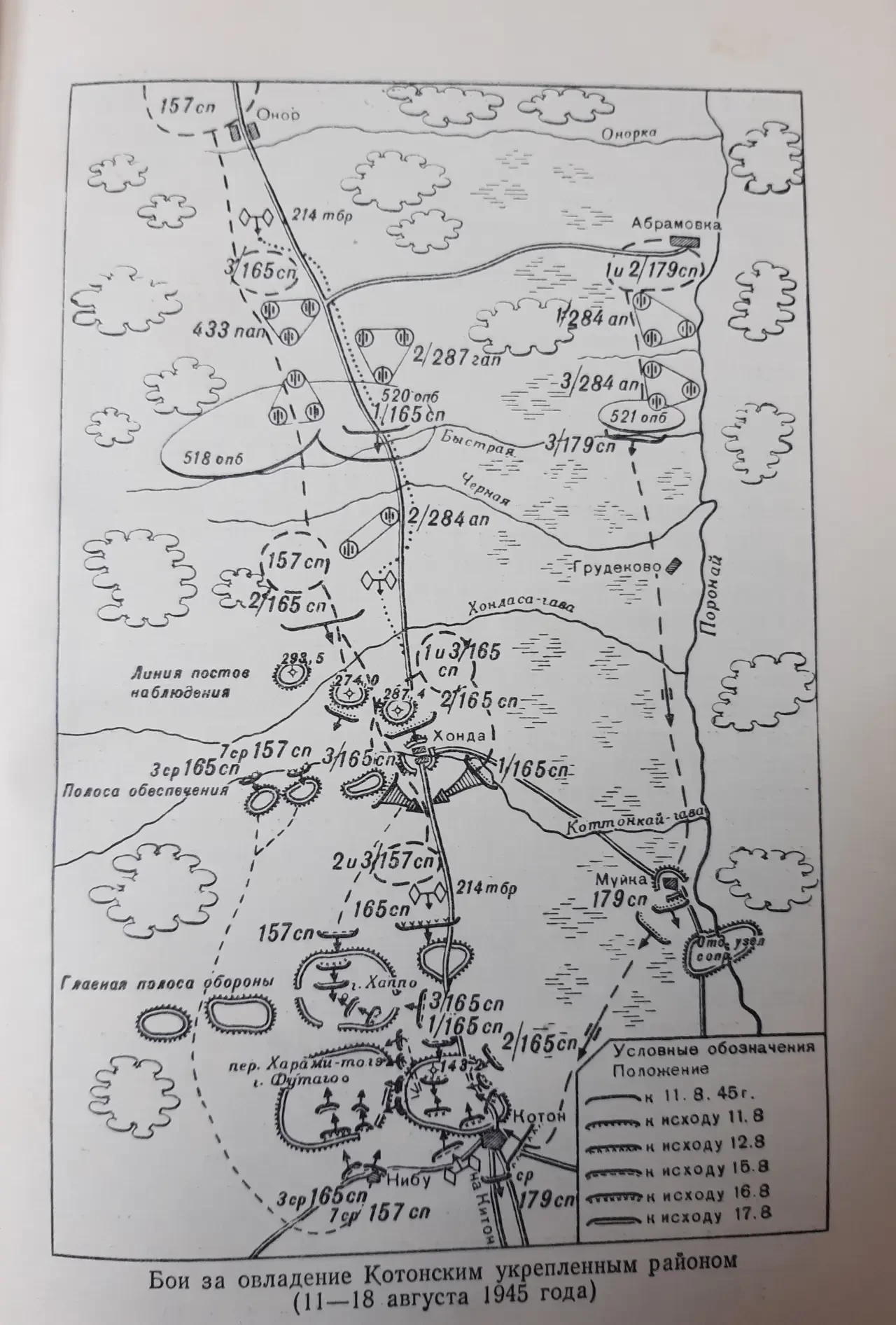 В этот момент положение японцев заметно ухудшилось. Советские силы были не только перед линией обороны, но и в тылу. Появление их у Котона — это серьезно. Южнее поселка находилась станция узкоколейки, рядом проходила Главная военная дорога. Это был главный транспортный узел всей системы обороны, взятие которого отсекало части японского 125-го полка от снабжения.