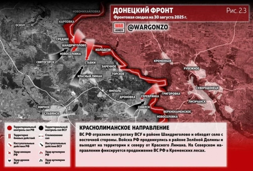 На Краснолиманском направлении ВС РФ отразили контратаку ВСУ в районе Шандриголово и обходят село с восточной стороны. Войска РФ продвинулись в районе Зелёной Долины и выходят на территории к северу от Красного Лимана. На Северском направлении фиксируется продвижение ВС РФ в Кременских лесах, сообщает Telegram-канал Wargonzoc.