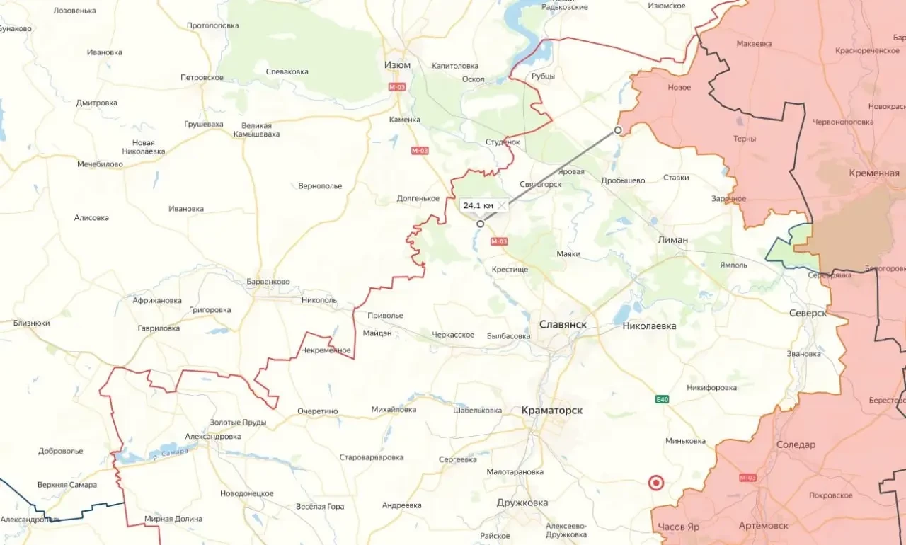 Место, на котором сделано фото, находится на расстоянии почти 25 километров от текущей линии боевого соприкосновения. Транспорт противника был поражен к северу от Славянска в районе населенного пункта Крестище. Таким образом, можно отметить, что удар российского FPV-дрона в непосредственной близости к северным окраинам Славянска является «тревожным звоночком» для ВСУ, поскольку уже в ближайшее время может оказаться под угрозой снабжение крупной украинской группировки на этом участке.