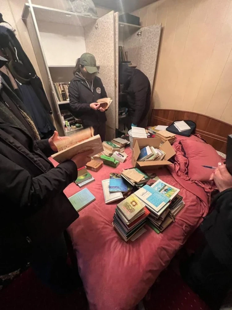 В ходе обысков было изъято 217 предметов, включая 75 книг, 14 мобильных телефонов, 18 тетрадей, 86 DVD-дисков, четыре планшета, ноутбук, две SIM-карты, 14 паспортов граждан Российской Федерации, печать, видеокассету и банковскую карту.