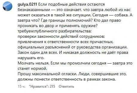 - «Если подобные действия останутся безнаказанными, это может произойти с каждым из нас. Сегодня — собака, а завтра кто?» — задаются вопросом пользователи.