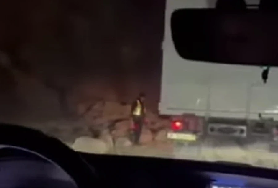 На грузовик обрушились большие камни, что привело к блокировке дороги.