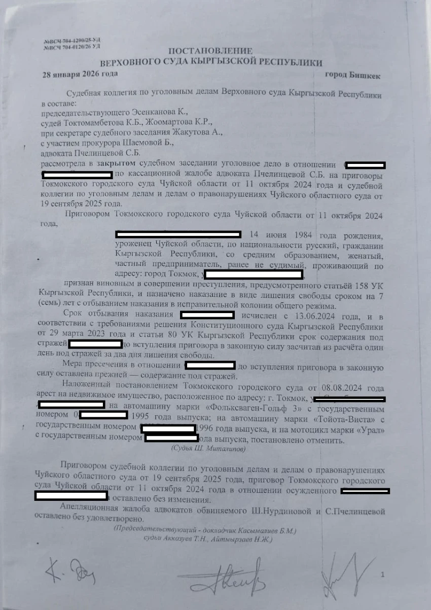 «Суды первой инстанции длились около полугода, и в итоге его осудили на семь лет по статьям 158 (развратные действия) и 34 (продолжаемое преступление). За это время у ответчика сменилось три адвоката, а нас защищает государственный адвокат. Они подали апелляцию в областной суд, и было более 12 заседаний, на одном из которых полностью сменился состав судей. В итоге областной суд оставил приговор без изменений. С.С. был направлен в колонию № 10 в Джалал-Абаде, где провел всего несколько месяцев, после чего его адвокат подал кассацию в Верховный суд с просьбой отменить приговор», — продолжила Лина.