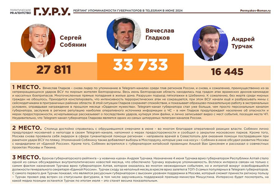Аналитический центр «Г.У.Р.У.» презентовал свежее исследование «Индекс Telegram. Рейтинг эффективности публичных политиков через призму Telegram. Июль 2024». Авторы использовали данные нейросети собственной разработки, которая фиксирует все публикации с упоминанием губернаторов в Telegram-каналах, сообщает pronline.ru.